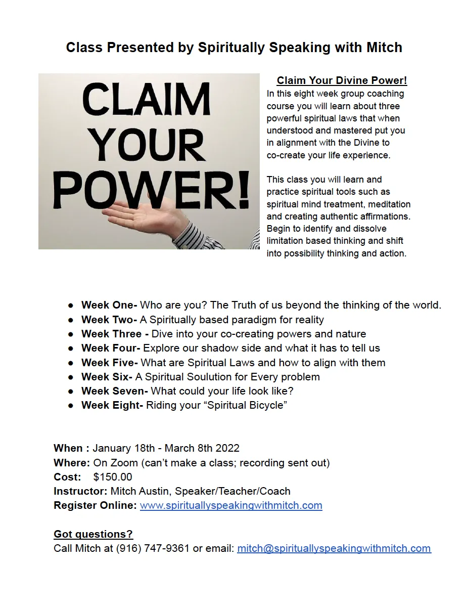 In this eight week group coaching course you will learn about three power spiritual laws that when understood and mastered put you in alignment with the Divine to co-create your life experience. This class you will learn and practice spiritual tools such as spiritual mind treatment, meditation and creating authentic affirmations. Begin to identify and dissolve limitation based thinking and shift into possibility thinking and action.